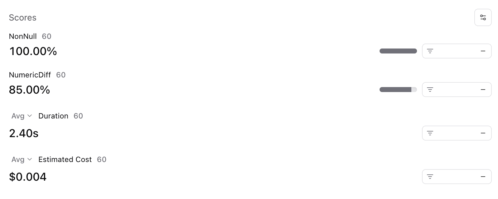 between 0 and 1, we'll use the NumericDiff scorer to assess accuracy, and a custom NonNull scorer to measure how many invalid tool calls are generated.