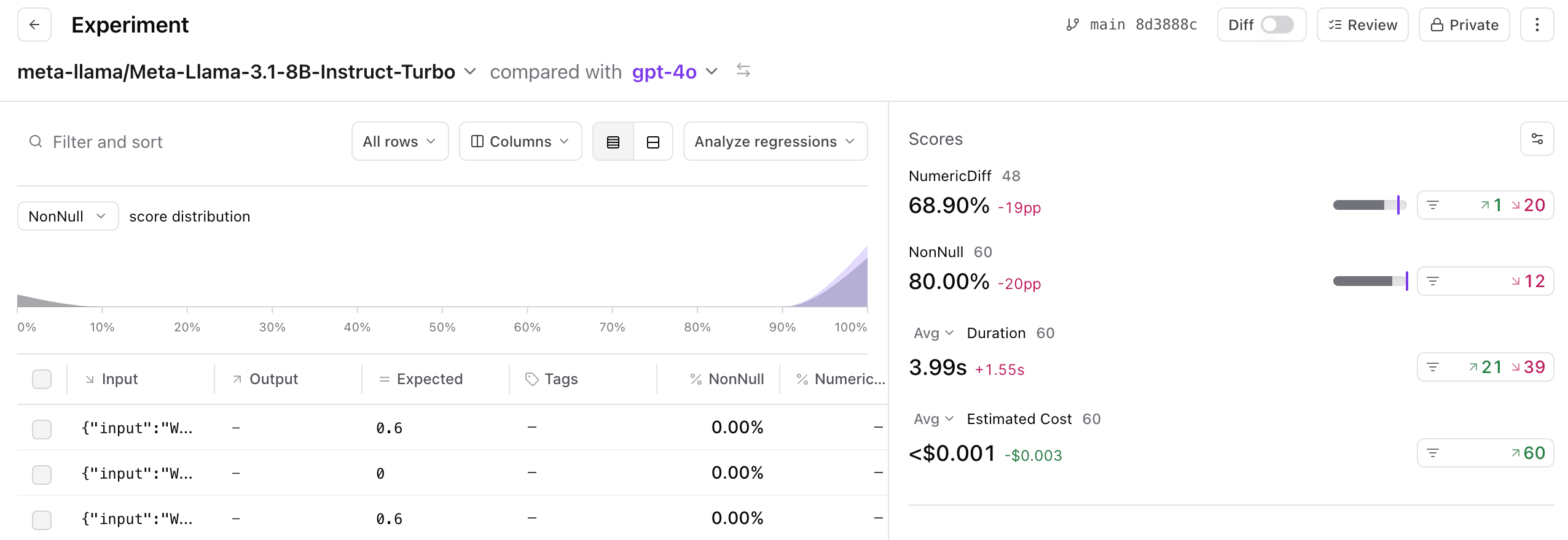 Ok, let's dig into the results. To start, we'll look at how LLaMa-3.1-8B compares to GPT-4o.